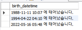 select date_format(birthdt, '%Y-%m-%d %H:%i 에 태어났습니다.') as birth_datetime