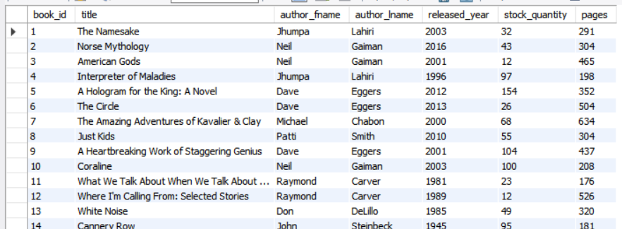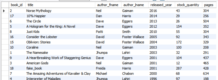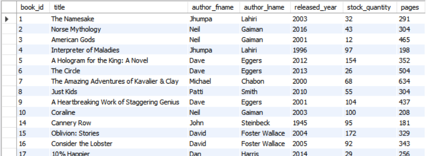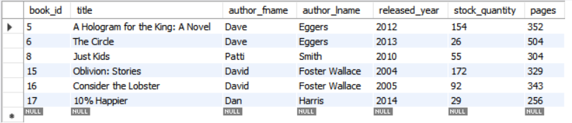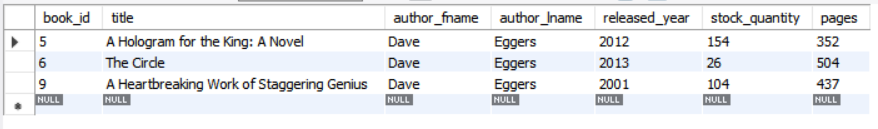 author_lname 이 'Eggers'이고, 년도는 2000년 이후이며 제목에 novel이 들어간 데이터를 가져오자