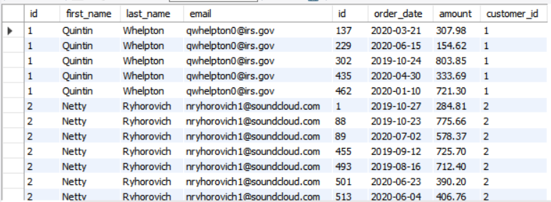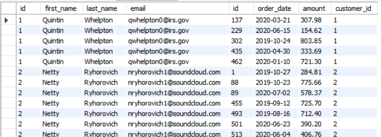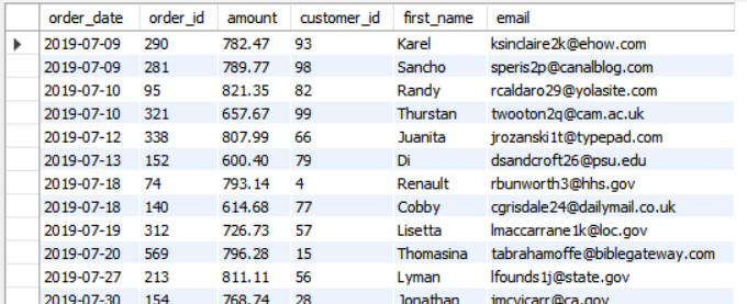 select order_date, o.id as order_id, o.amount, c.id as customer_id, c.first_name,c.email