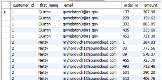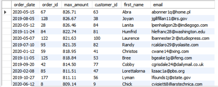 select order_date, o.id as order_id, max(o.amount) as max_amount, c.id as customer_id, c.first_name,c.email