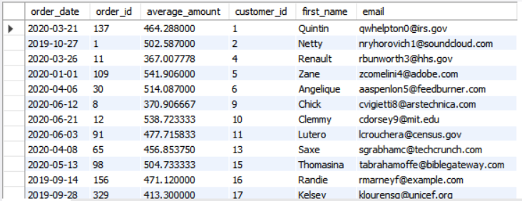 select order_date, o.id as order_id, avg(o.amount) as average_amount, c.id as customer_id, c.first_name,c.email
