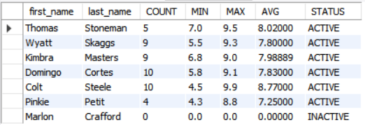 리뷰어의 이름과 리뷰한 개수, 레이팅의 최소, 최대, 평균값을 나타내고 리뷰한것이 없으면 INACTIVE, 있으면 ACTIVE로 표기한다.