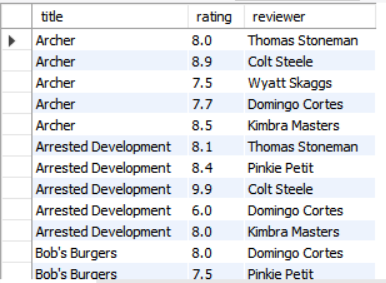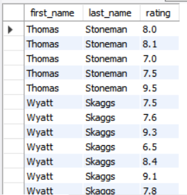 리뷰어의 성과 이름 그리고 rating을 나타내자