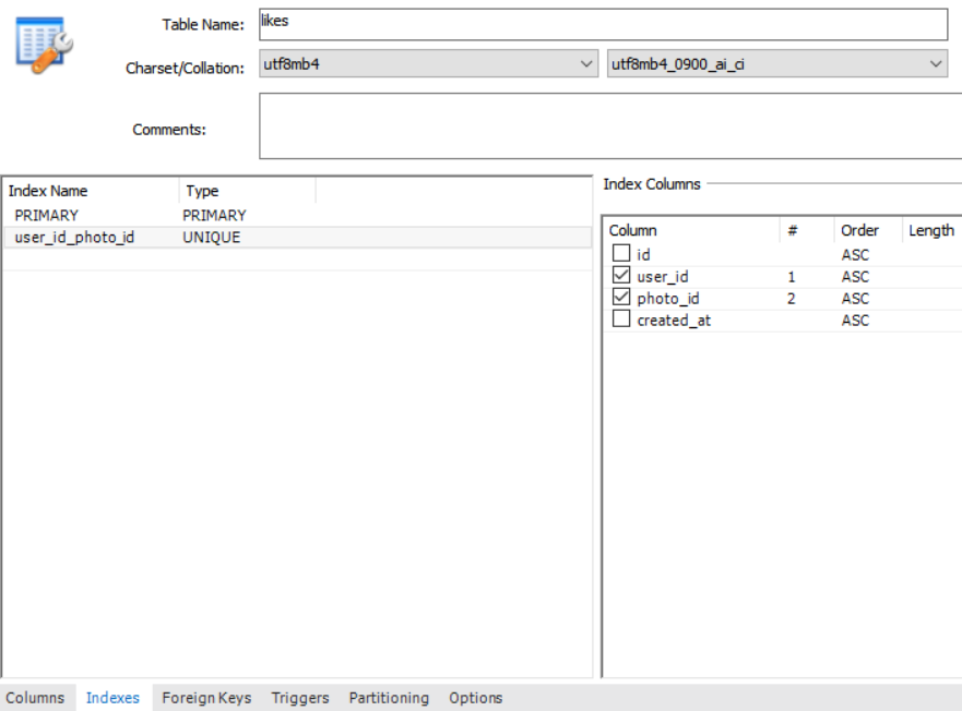 테이블을 설정할때 인덱스로가서 인덱스로 관계성이 있는 두개의 id 컬럼을 정하고 unique로 설정한다.