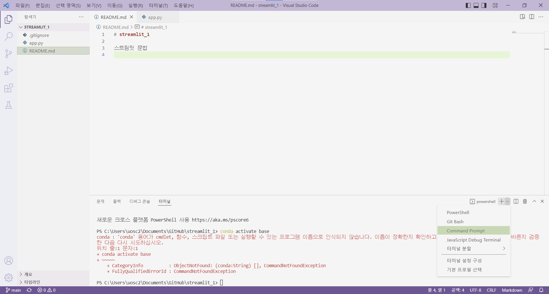 ※ 경로에 문제가 있다면 conda activate base로 설정해본다.