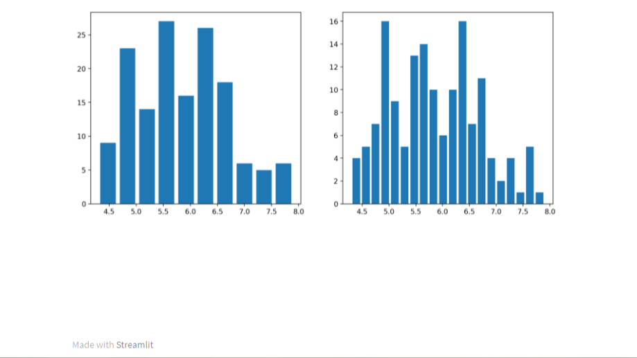 sepal_length의 히스토그램을 그리되 bin의 개수를 10개와 20개로 두개의 차트를 수평으로 보여주자