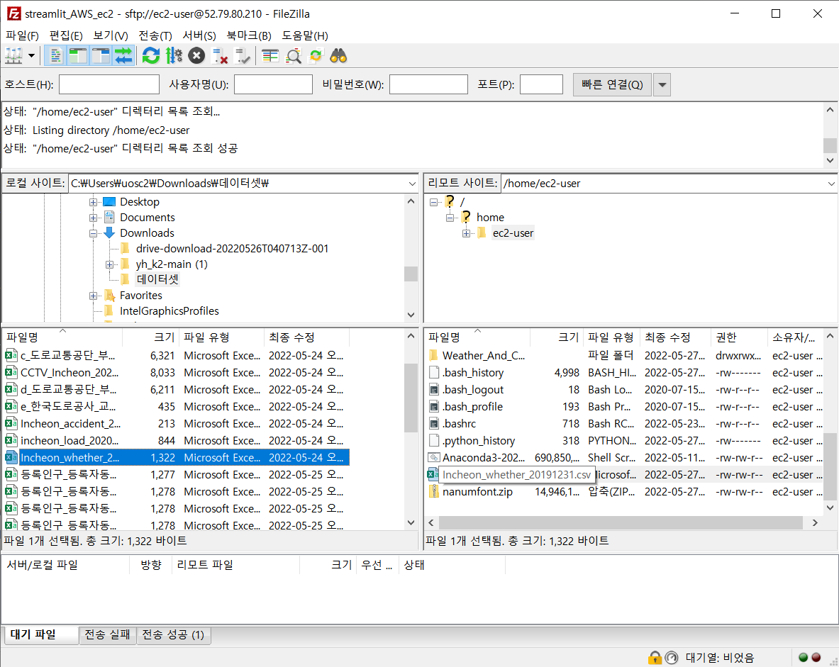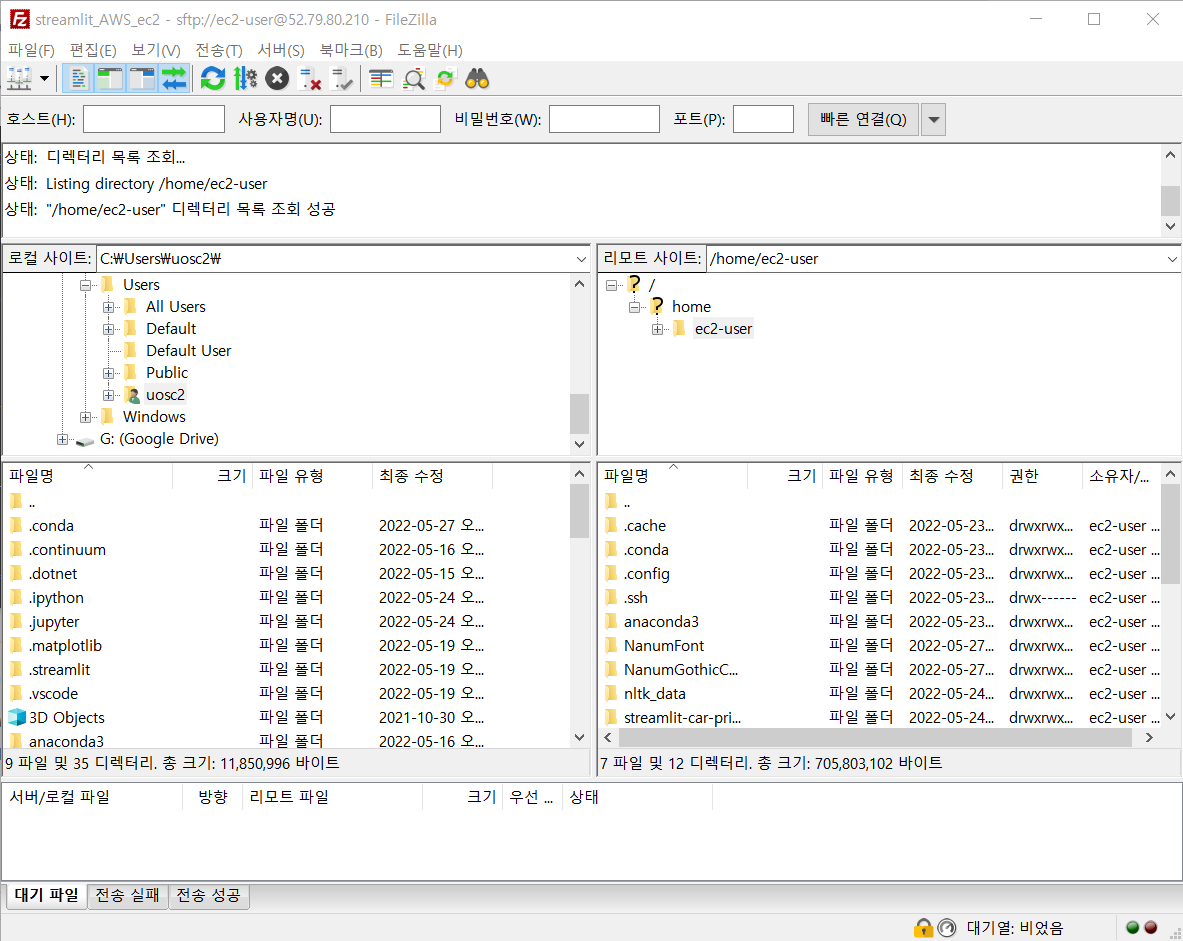하단의 왼쪽이 로컬, 오른쪽이 ec2서버다.