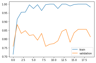 plt.legend(['train','validation'])