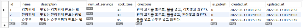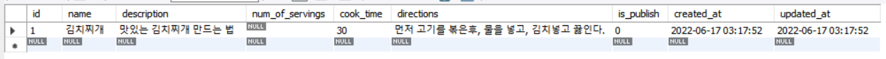 ('김치찌개', '맛있는 김치찌개 만드는 법', 30 , '먼저 고기를 볶은후, 물을 넣고, 김치넣고 끓인다.');