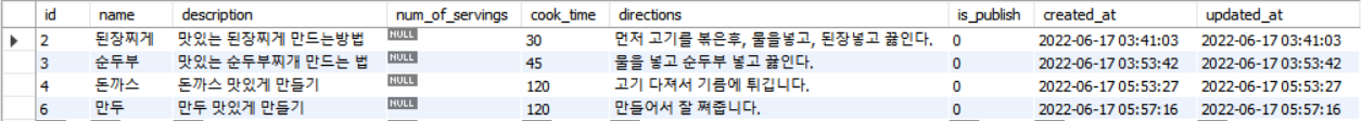 레시피 공개하는 테이블과 임시저장하는 테이블