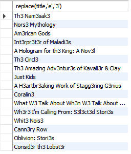 title 컬럼에 들어있는 e를 3으로 바꿔서 가져와라