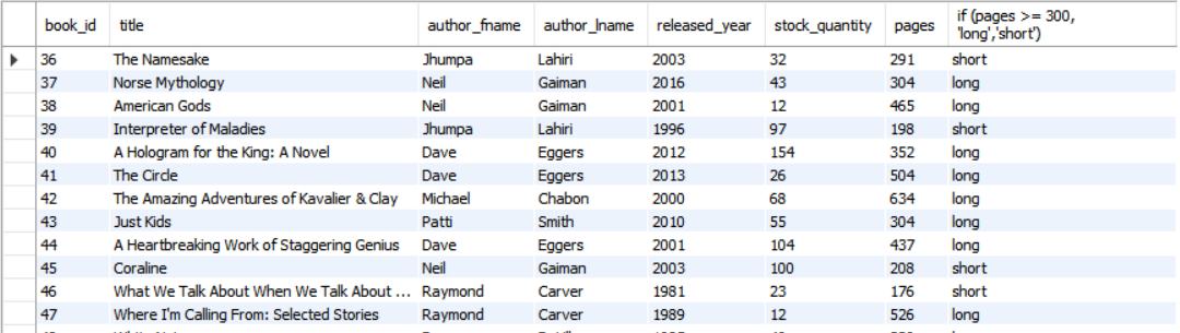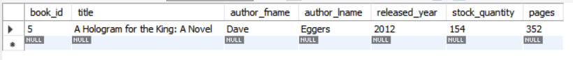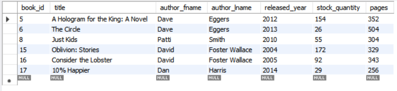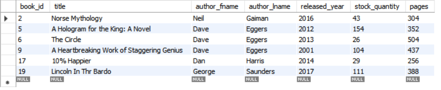 author_lname 이 'Eggers'이고, 년도는 2000년 이후이며 제목에 novel이 들어간 데이터를 가져오자